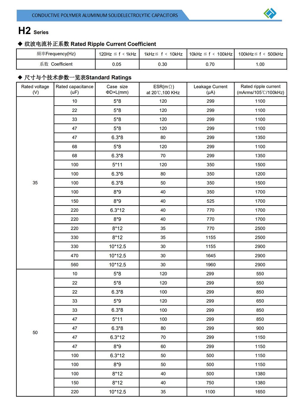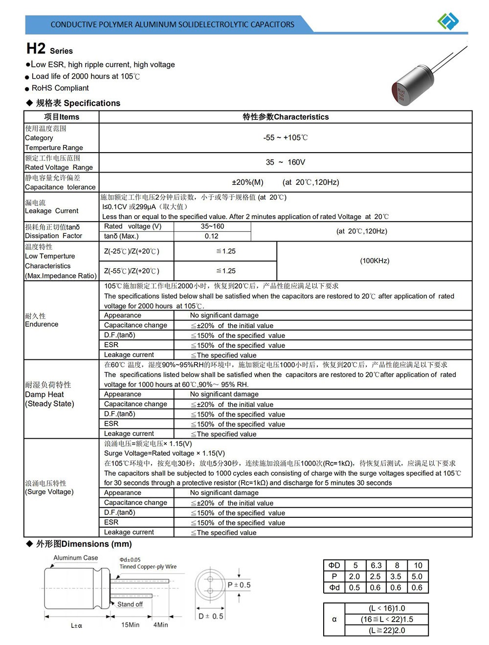 ● Low ESR, high ripple current, high voltage ● Load life of 2000 hours at 105℃ ● RoHS Compliant