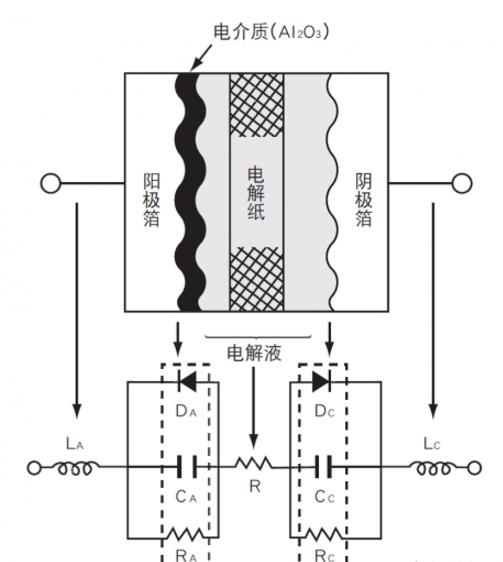 電容的等效電路作為鋁電解電容的電介質(zhì)氧化膜(Al2O3)的介電常數通常為8~10,這個(gè)值并不比其他類(lèi)型的電容大,但是,通過(guò)對鋁箔進(jìn)行蝕刻擴大表面積,并使用電化學(xué)的處理得到更薄更耐壓的氧化電介質(zhì)層,使鋁電解電容可以取得比其他電容器更大的單位面積CV值。